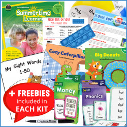 Summertime Learning Activity Book: Kindergarten to 1st Grade - Monday-Thursday lessons that cover reading, writing, and math. Friday activities that provide fun brain teasers. Over 300 stickers in each book to track progress and reward good work